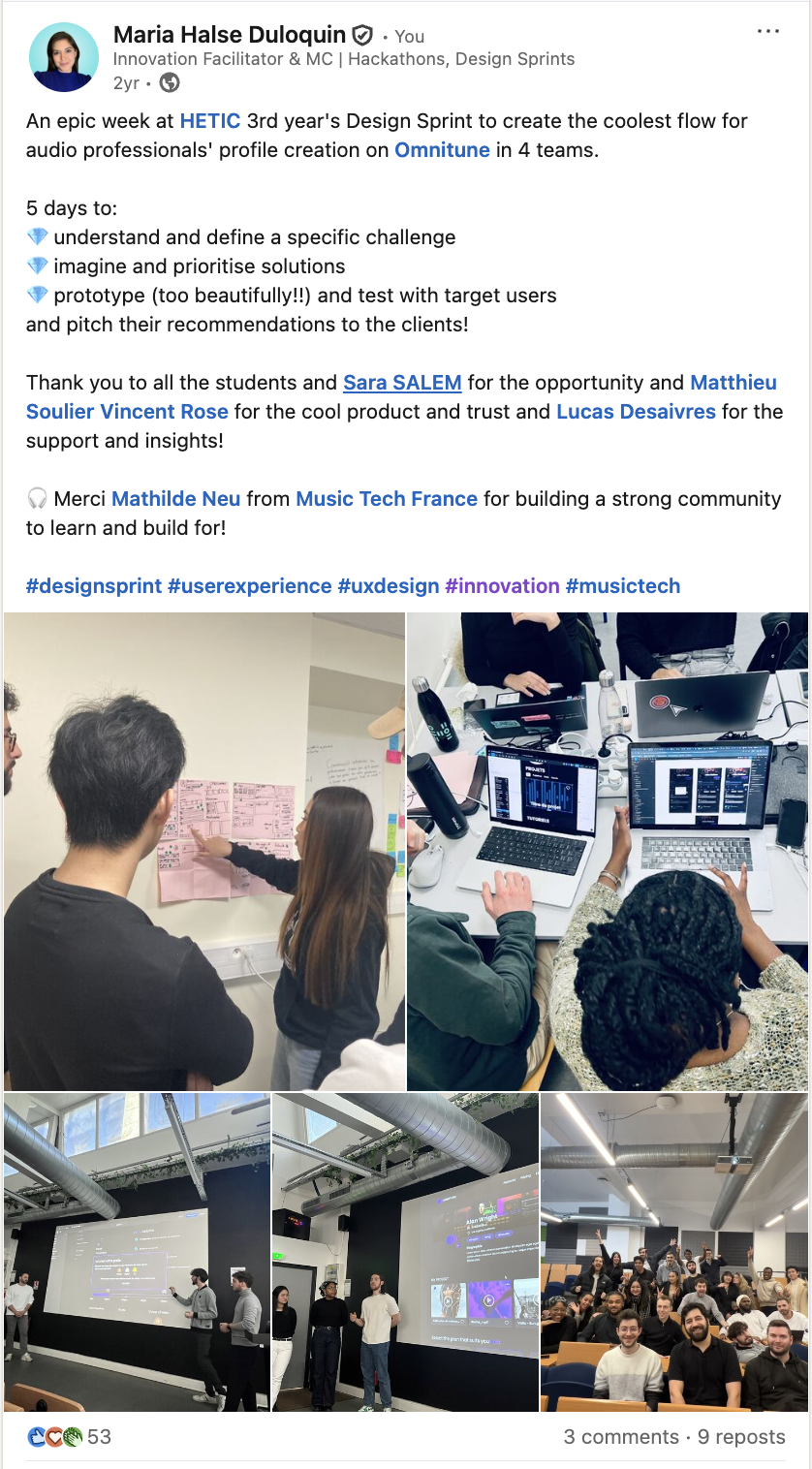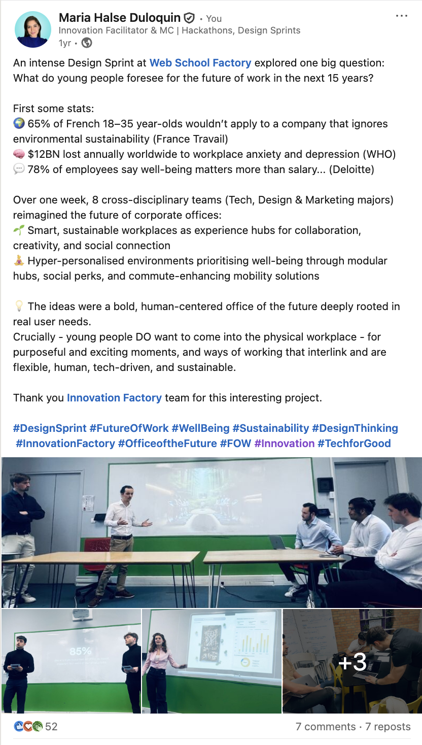 Le sprint est facilité par une Design Sprint Master professionnelle, garantissant l’engagement des étudiants, la qualité des livrables et des résultats exploitables pour votre entreprise.