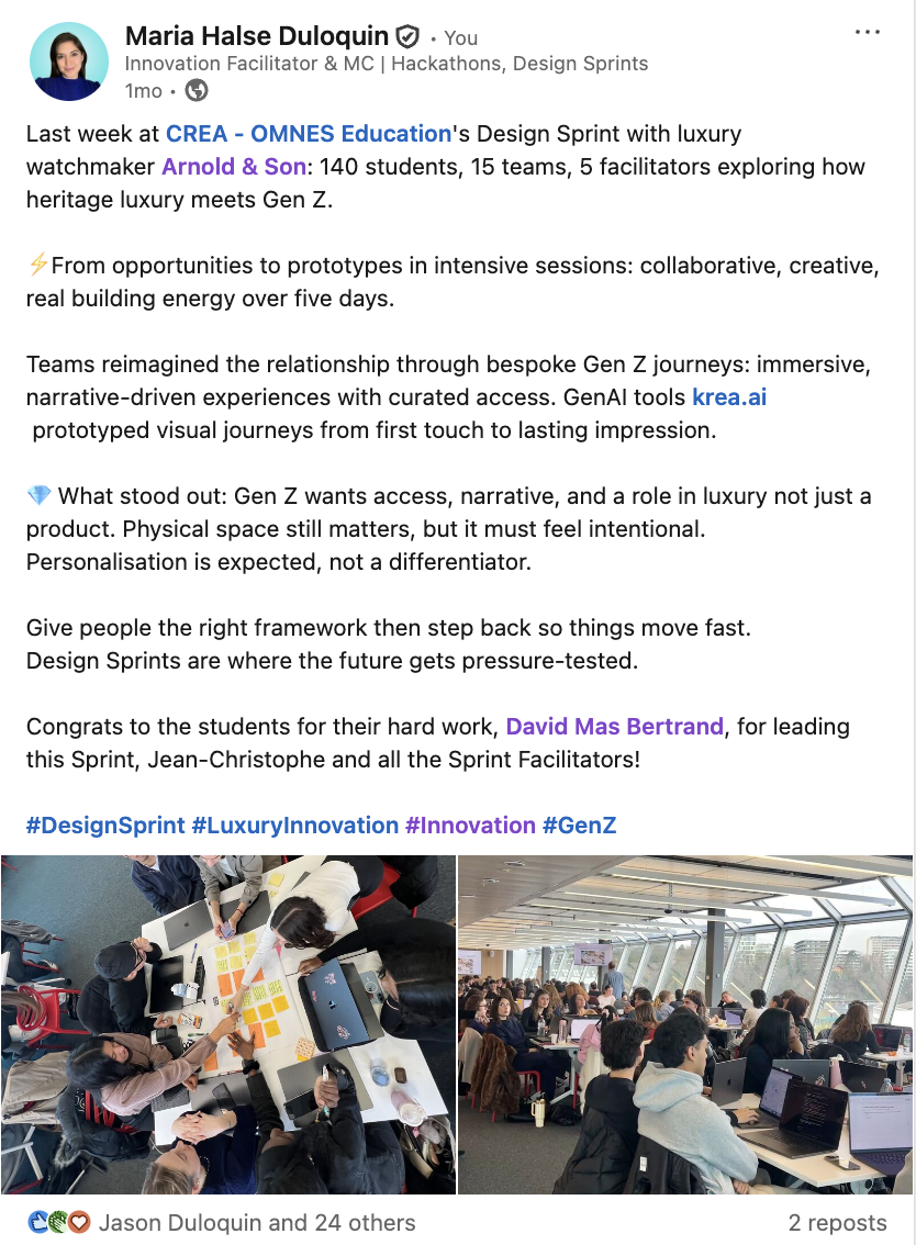 En seulement cinq jours, vos équipes peuvent tester rapidement des idées, valider des concepts et révéler de nouveaux insights — grâce à la méthode éprouvée du Design Sprint de Google Ventures, combinée à la créativité et à la maîtrise digitale des étudiants Gen-Z les plus prometteurs.