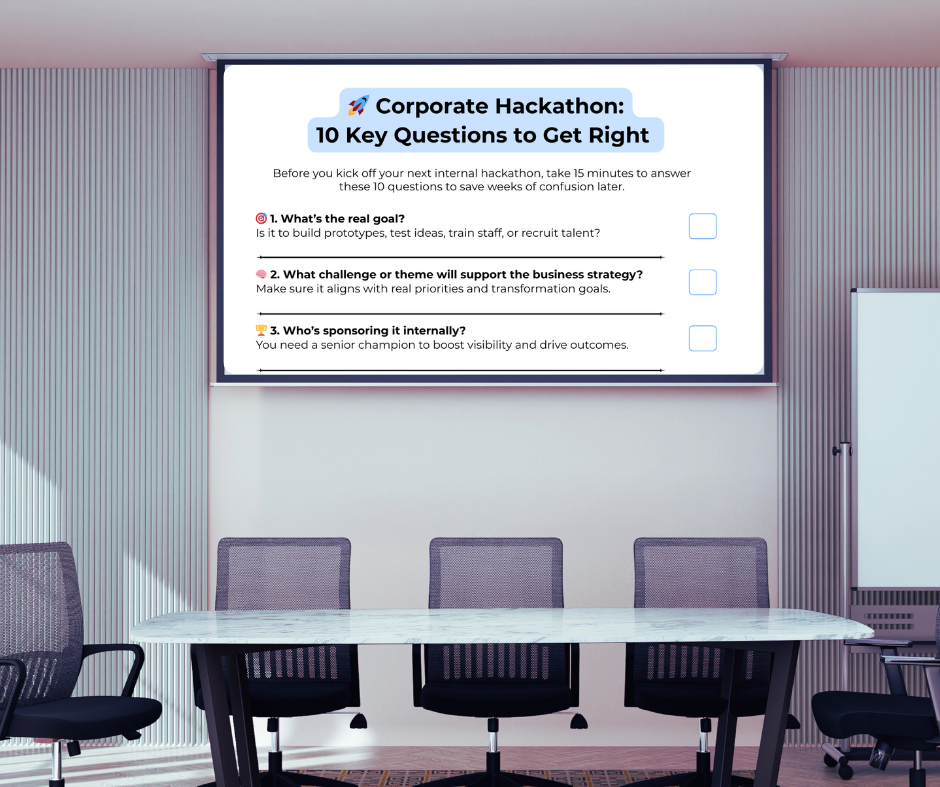 Maria Halse Duloquin 9/9/25 Maria Halse Duloquin 9/9/25 Partner with Gen Z Talent: Join Our 2026 Student Design Sprints Read More Maria Halse Duloquin 9/5/25 Maria Halse Duloquin 9/5/25 🚀 Why Hackathons Can Drive Innovation Across All 3 Horizons Read More Maria Halse Duloquin 9/3/25 Maria Halse Duloquin 9/3/25 How Long Does It Really Take to Plan a Corporate Hackathon? Read More Maria Halse Duloquin 9/1/25 Maria Halse Duloquin 9/1/25 🌱 Sustainability Metrics: Measuring the Impact of Innovation Events Read More Maria Halse Duloquin 8/29/25 Maria Halse Duloquin 8/29/25 🧨 “We Need a Hackathon- Fast!” Here’s What to Do (and Avoid) Read More Case Study, Blog Maria Halse Duloquin 7/9/25 Case Study, Blog Maria Halse Duloquin 7/9/25 Groupe Bel: Building Intrapreneurs, Fast. Read More Maria Halse Duloquin 6/3/25 Maria Halse Duloquin 6/3/25 Internal vs External Hackathons: Which One Is Right for You? Read More Maria Halse Duloquin 5/6/25 Maria Halse Duloquin 5/6/25 💡 What Is a Corporate Hackathon (and Why It’s Your Secret Innovation Weapon) Read More Maria Halse Duloquin 3/23/25 Maria Halse Duloquin 3/23/25 Circular Economy: The Innovation Catalyst for Our Future Read More Maria Halse Duloquin 2/4/25 Maria Halse Duloquin 2/4/25 🚀 10 Things to Clarify Before You Plan a Corporate Hackathon Read More Case Study, Blog Maria Halse Duloquin 1/24/25 Case Study, Blog Maria Halse Duloquin 1/24/25 Corporate Hackathon Case Study: Inside Aviva’s 2-Day Innovation Sprint Read More Maria Halse Duloquin 1/13/25 Maria Halse Duloquin 1/13/25 How Defining your Sustainable Development Goals Can Accelerate Innovation Read More Maria Halse Duloquin 1/8/25 Maria Halse Duloquin 1/8/25 How the Circular Economy can kickstart your innovation strategy Read More Maria Halse Duloquin 1/6/25 Maria Halse Duloquin 1/6/25 10 types of sustainable innovation Read More Maria Halse Duloquin 1/3/25 Maria Halse Duloquin 1/3/25 Sustainable Innovation for the New Normal Read More