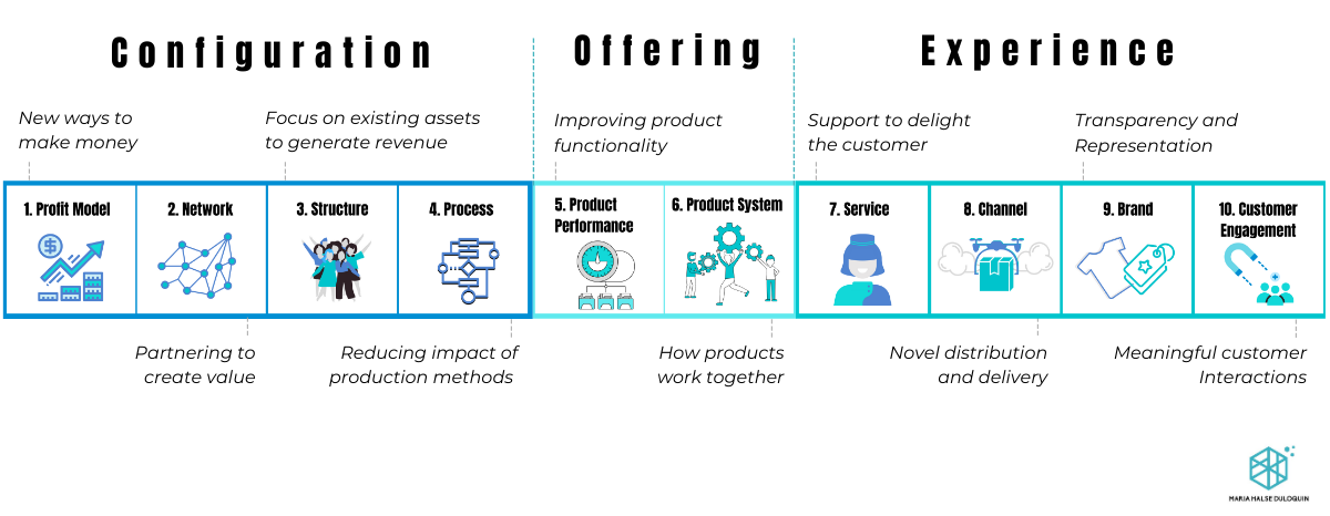 The Ten Types of Innovation framework from Deloitte's innovation branch, Doblin, is a useful tool to examine existing practices and to identify the potential across three main categories: Configuration (business model), Offering (product) and Experience (marketing).