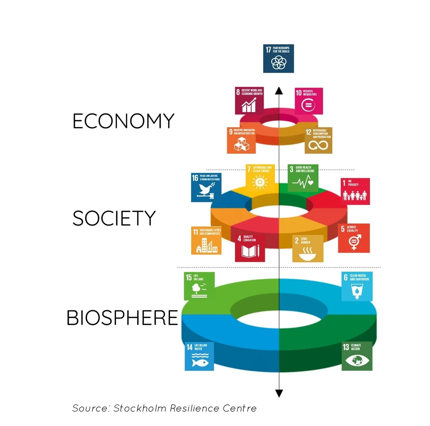 The SDGs can often look like a long list, however, are very interconnected. This clever model from the Stockholm Resilience Centre shows how ECONOMY, SOCIETY and BIOSPHERE all work together, and, right at the top: COOPERATION + PARTNERSHIP (SDG 17) enforces the need for cooperation and partnerships to make the rest of the goals happen.